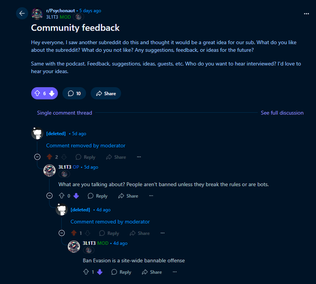 And I’m far from alone. In a feedback thread from a psychedelic community, a moderator asked for suggestions to improve the space—a rare chance for users to speak up. One user did, bravely calling out the unchecked power of moderators. Their words were a plea for fairness, for a system that values the community over the whims of a few. But what happened? Their comment was deleted. The moderator replied, “People aren’t banned unless they break the rules”—then banned the user moments later accusing them of “ban evasion” for trying to reply. The exchange, captured below, lays bare the hypocrisy and the silencing at the heart of Reddit’s moderation system.